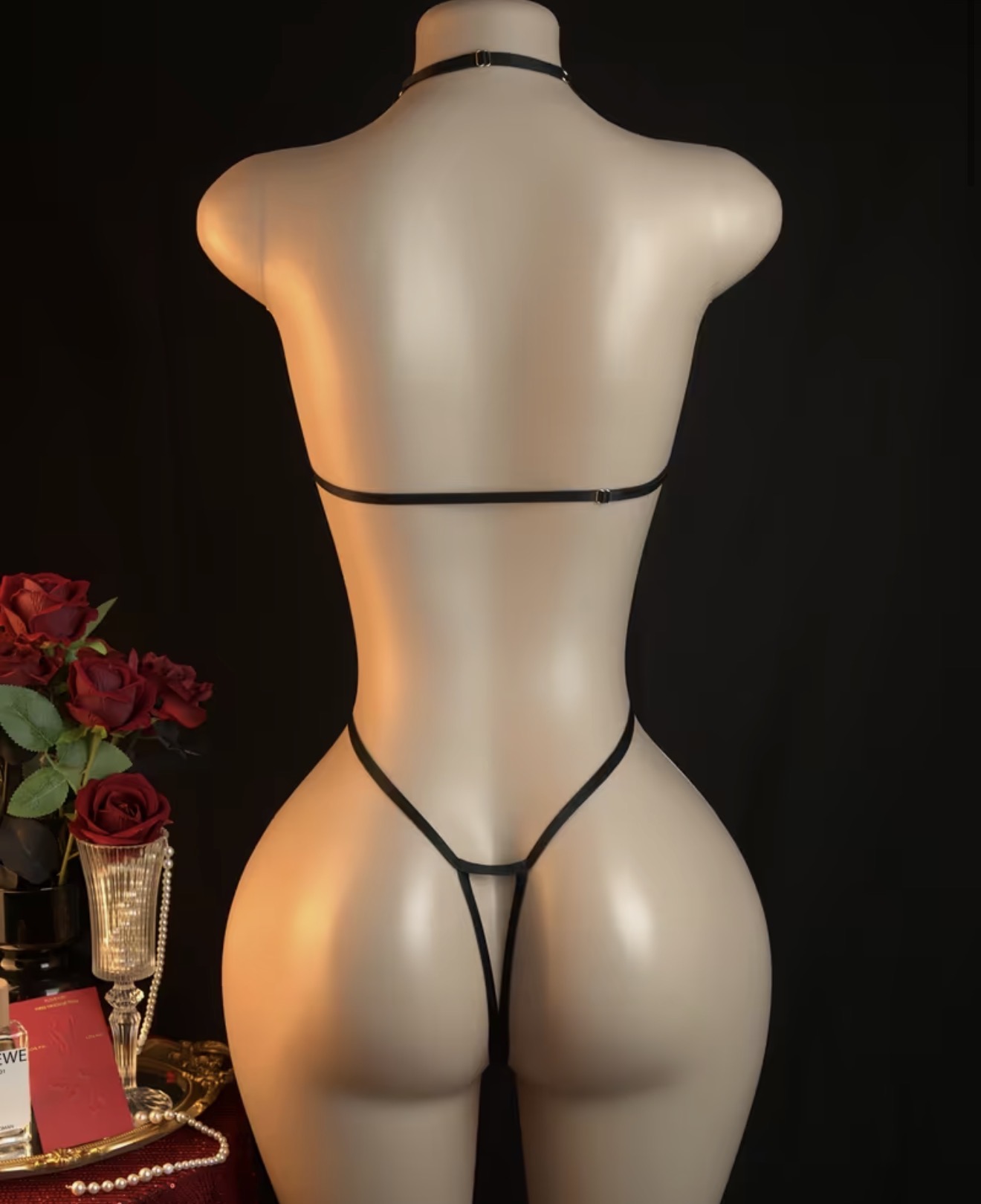 Designed with daring minimalism and decadent detail, this set celebrates the art of allure. The silky black material catches the light with every move, sculpting your curves while leaving just enough to the imagination. Each strap, ring, and curve has been thoughtfully designed to accentuate your shape, highlight your confidence, and leave a lasting impression long after you’ve left the room.