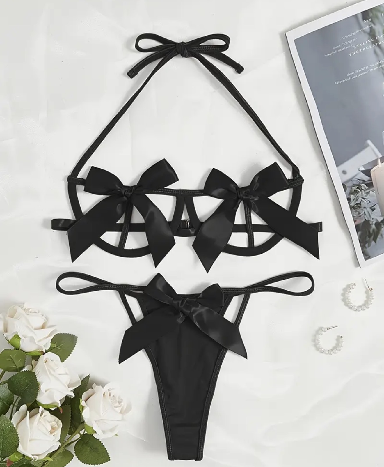 • Design: Strappy halter bra with open-frame cups and front clasp closure, paired with a matching high-cut thong.
